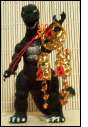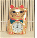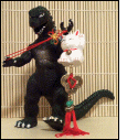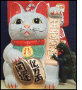 This big boy is my pride and joy. It is a 13 inch Ceramic Maneki Neko Bank with realistic whiskers. It is the first large one I ever bought and at an amazing $13.95 I couldn't pass him up. Usually Nekos of this size are around $40 or more so it was a real deal. Right now he is filled with money and brings much prosperity for the family. Godzilla is trying to climb him to demonstrate size proportion.