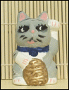 This home made cutie is a plaster casting of a small Maneki Neko that my husband painted to look like my kitty Fatso. He gave it to me for my birthday and it made me cry because it was the sweetest most thoughtful adorable thing that honey pie ever gave me for my birthday. Fatso passed away in November of 2005 when complications of his diabetes caused his kidneys and liver to fail. I miss him dearly. I would definitely have to say that this Maneki Neko is the most special one to me in my collection.