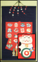 This is a fabric wallhanging I found at a local thrift stoe for $2.00. It has a kimono design on it and a series of lucky symbols like owl, fish, pineapple, daruma, monk and of course, Maneki Neko, who for some bizarre reason is holding a target with an arrow through it.