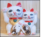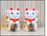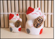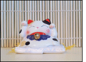 This is a family of two porcelain Maneki Nekos. I found them in a shop in China town when I was birthday shopping for my husband. They were the only fortune cats the store had and they were only $5.99, I'm assuming because the paint was all screwed up and rubbed/chipped off in some spots. I really liked the way they looked, the worn paint gives them a certain cretinous charm, and the faces they have are far nicer than some others I've seen. I keep them on my window sill, right by where Lucky (my real cat) likes to lurk.