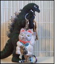 Again Godzilla is modelling yet another of my cats. This is my current keychain, a squishy foamy Maneki Neko from accoutrements. I bought it at a hip novelty store that stocks Jesus action figures, vintage handbags, tiki mugs, wide selection of Pez, etc. The paint is rubbed off in some areas and it's pretty dirty so I may replace it with something else soon.