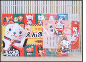 This was a great find from JList. It's a box of Maneki Neko cookies (the cookies actually have nekos on them!), and each box comes with a charm on a small lanyard. There are several charms available and you never know which kind you'll get. I bought two boxes and got the classic Maneki Neko pictured on the box (it's still in it's package propped up against the box in the picture), and a little Buddhist priest. There are around 10 cats you can get, so odds are good if you buy a few boxes you'll get at least one Maneki Neko. But there are also other Japanese symbols of luck and good fortune like frogs, rams, owls, bulls, Daruma, hariko-inu... well you get the idea. The cookies actually taste good and cost $2.50 per box.