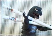 Our lovely model Godzilla is holding my Maneki Neko chopsticks. They came from the same seller in Hawaii. They are white with cats big and small painted on them, and little coins dotting the length of the sticks. I actually use them, so the paint is wearing off a bit, but they look great and are really nice to use.